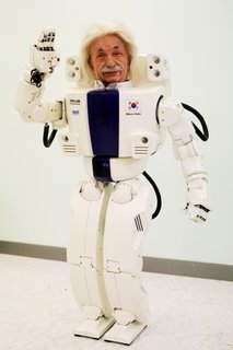 Tout en bas Albert Einstein monté sur un robot style Asimo.