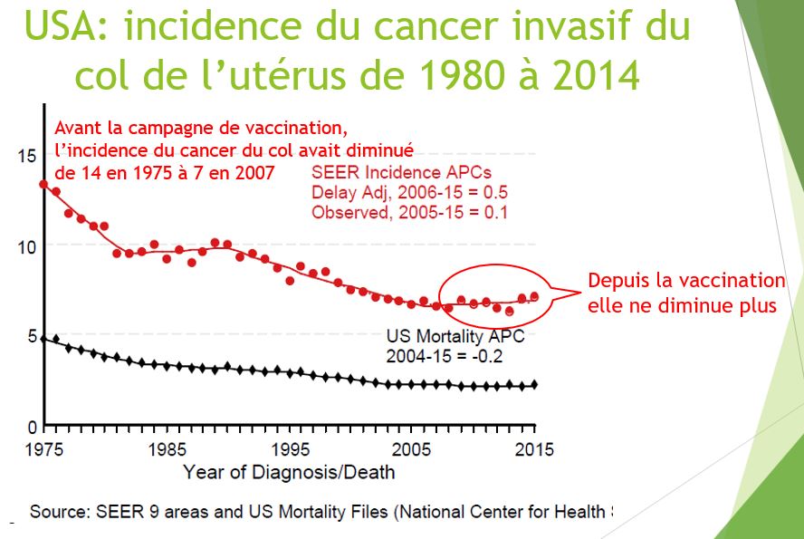 Par contraste avec l’’efficacité prouvée du dépistage par frottis, les vaccins Gardasil ou Cervarix 12 ans après leur autorisation de mise sur le marché, n’ont toujours pas prouvé qu’ils étaient capables d’éviter un seul cancer invasif du col de l’utérus et les relevés des registres du cancer suggèrent même que ce vaccin est parfois susceptible d’en augmenter le risque.