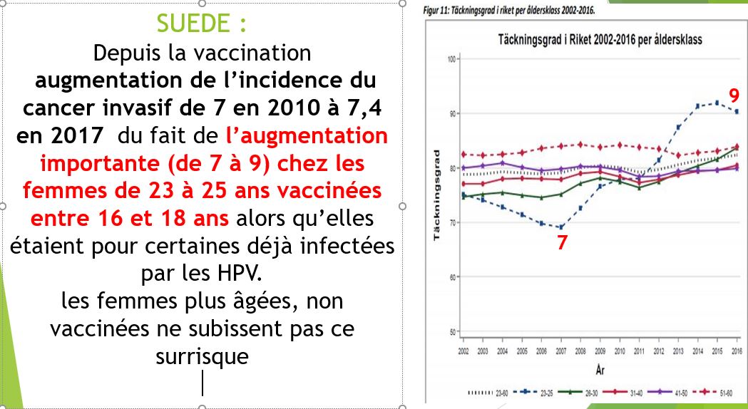 En Suède, d’après le Nationellt Kvalitetsregister för Cervix cancerprevention (NKCx) : avant la campagne de vaccination, l’incidence du cancer du col avait diminué (grâce au dépistage) de 18 en 1967 à 7 en 2006[28]. Dans ce pays, l’incidence standardisée monde du cancer du col de l’utérus a augmenté significativement depuis la vaccination passant à 10.3 en 2012 et 11,49 en 2015[29]. Cet accroissement est presque exclusivement dû à l’augmentation de l’incidence du cancer invasif chez les femmes de 23 à 49 ans qui atteint plus de 50% depuis 2006 (11 en 2006 versus 17 en 2015), alors que ce sont celles qui ont le taux de couverture vaccinale le plus élevé (85%)[30].